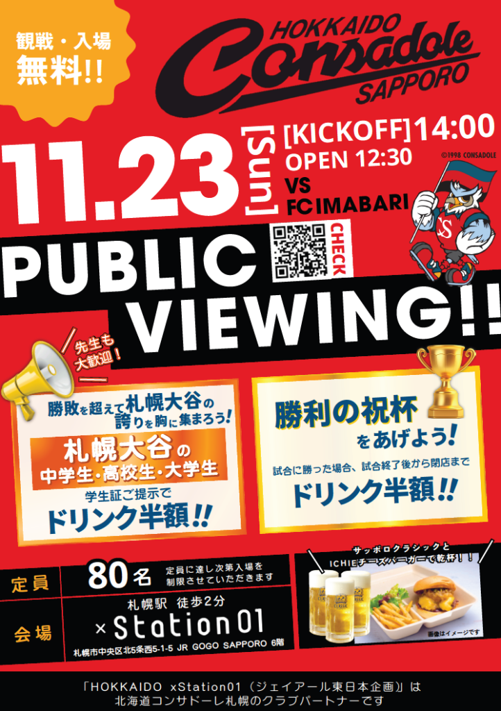 3期連続となる「北海道コンサドーレ札幌」のパブリックビューイングを札幌駅から徒歩2分のHOKKAIDOxStation01で開催!今年の飲食コラボはコンサドーレオフィシャルパートナーのいちえ北海道さん!今季最後のパブリックビューイング、みんなで盛り上がろう!