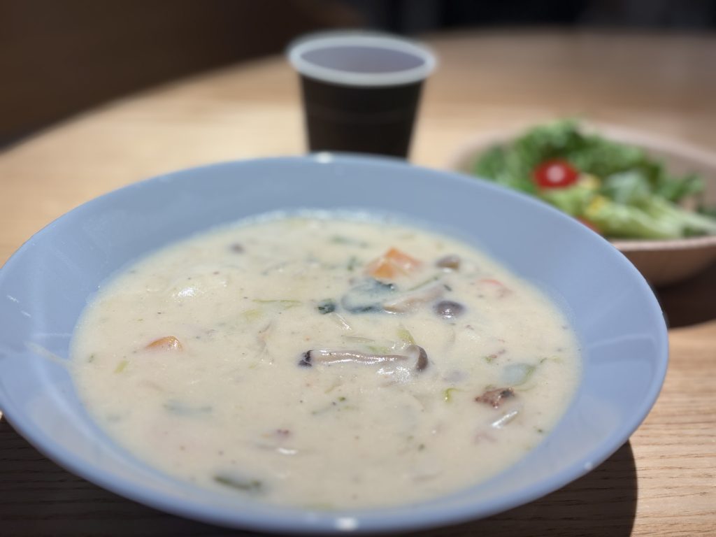健康を意識したメニューは、具沢山シチュー・グリーンサラダ・玄米パンなど。