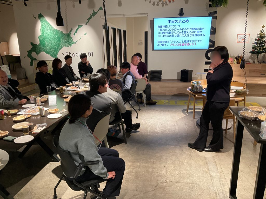 xStation01で定期開催している会員交流会。今回のテーマは「健康を考える」そしてクリスマス気分も楽しむ! 総勢19名が集まり、業種も旅行・エンジニア・不動産・原料メーカー・ウェルネス・ドローンなど多彩。初参加の方もいて、会場はワクワクした雰囲気に包まれました。